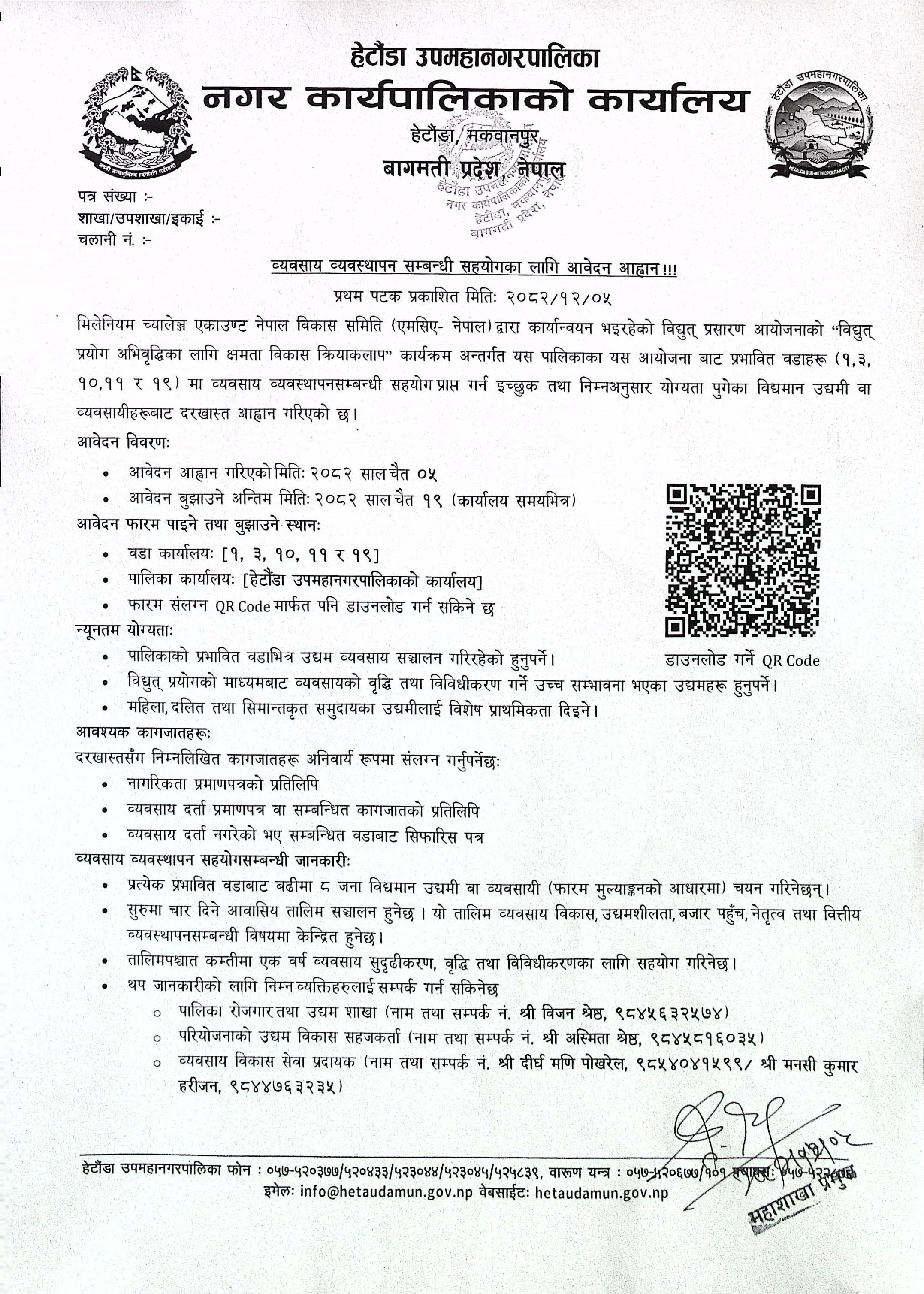 व्यवसाय व्यवस्थापन सम्बन्धी सहयोगका लागि आवेदन आव्हान !!