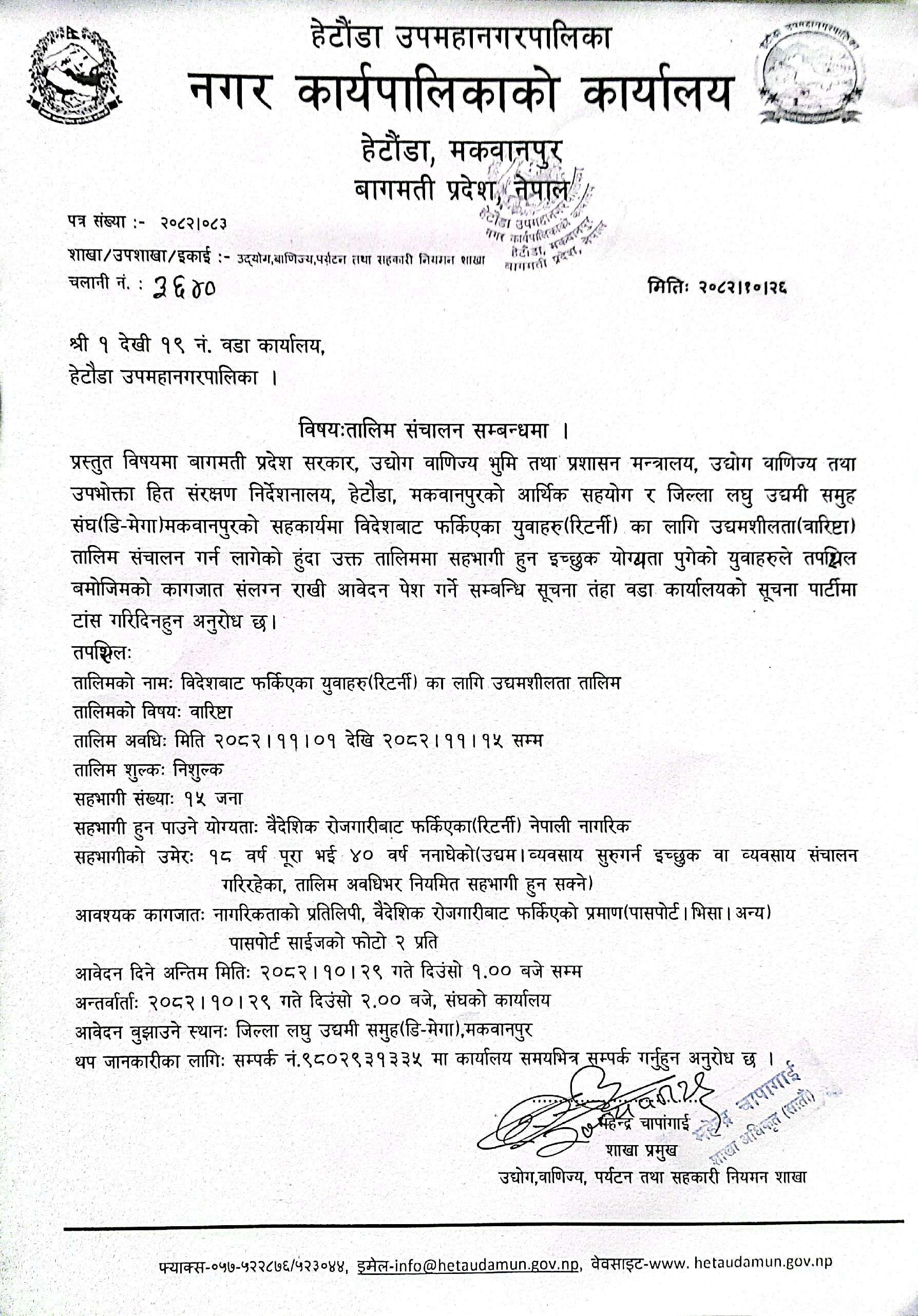 वारिष्टा तालिम सञ्चालन सम्बन्धी सूचना !