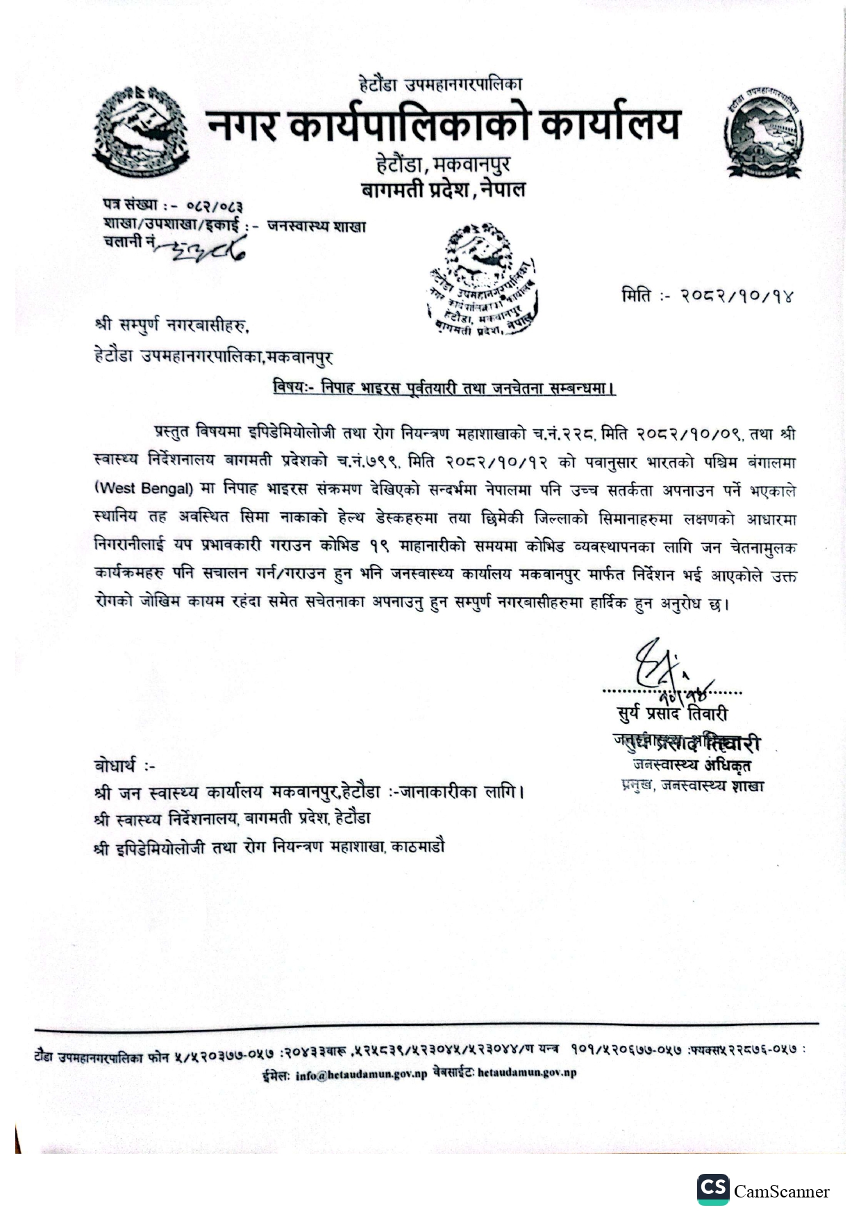 निपाह भाइरस पूर्वतयारी तथा जनचेतना सम्बन्धी सूचना !