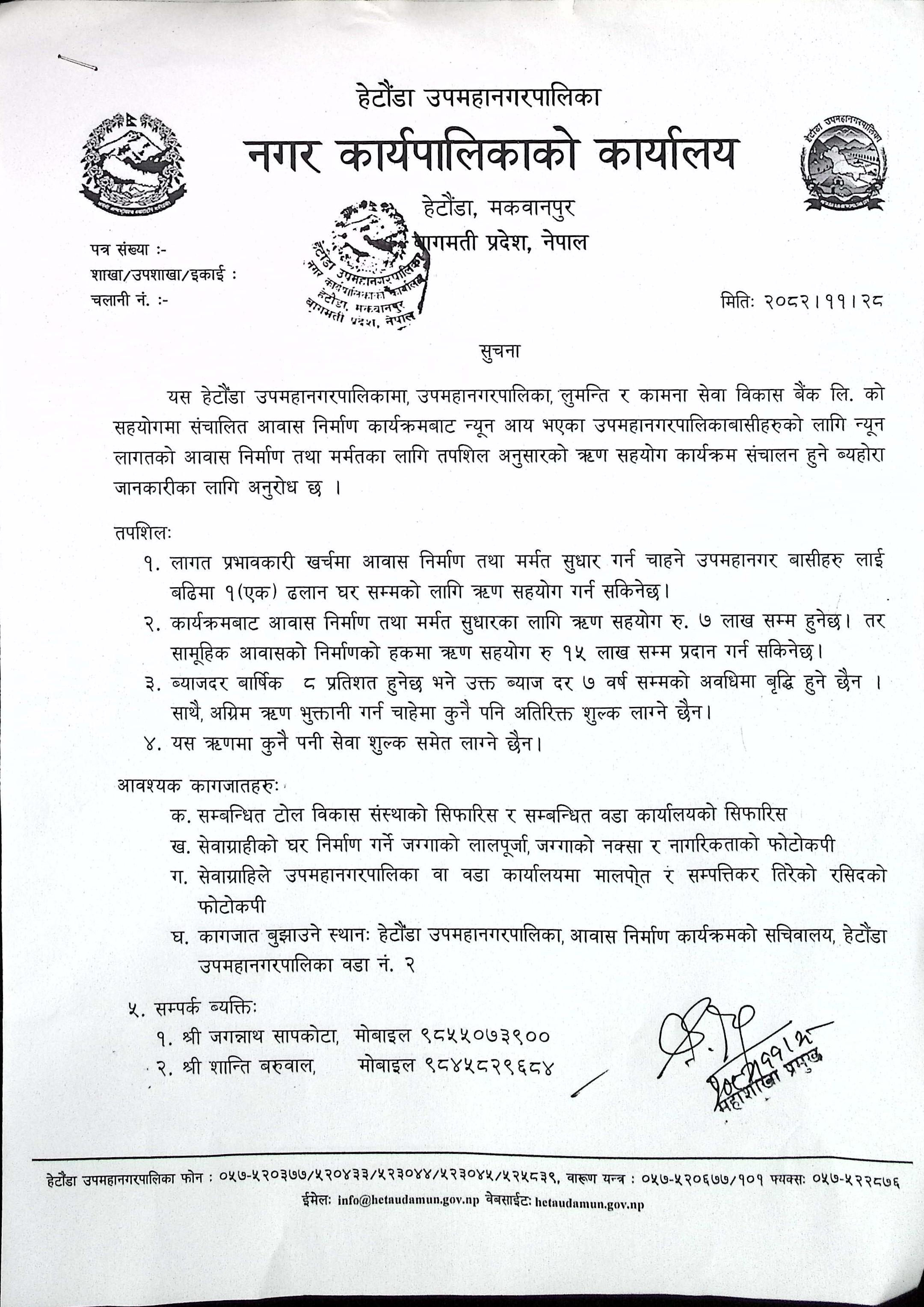 न्यून लागतको आवास निर्माण तथा मर्मतको लागि ऋण सहयोग कार्यक्रम सञ्चालन हुने सूचना !