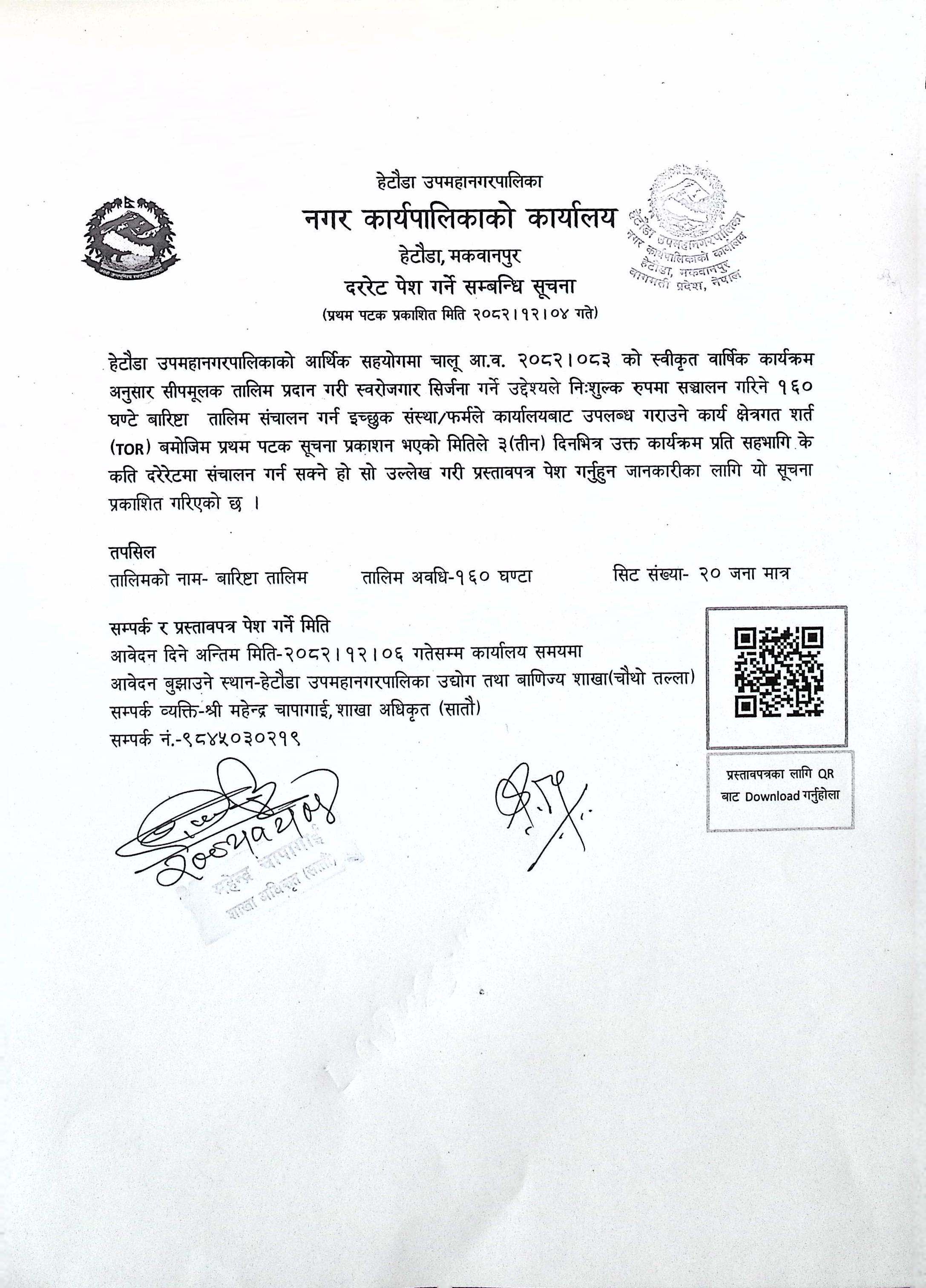 बारिष्टा तालिमका लागि दररेट पेश गर्ने सम्बन्धी सूचना !