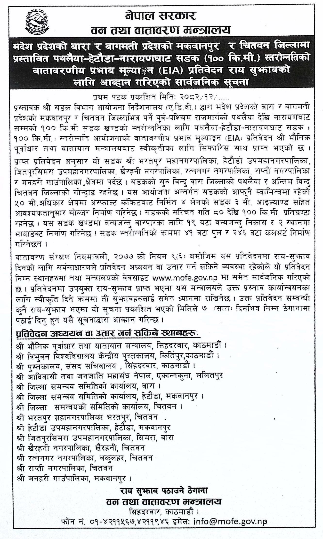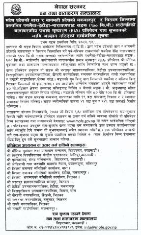मदेश प्रदेशको बारा र बागमती प्रदेशको मकवानपुर र चितवन जिल्लामा प्रस्तावित पथलैया-हेटौंडा-नारायणघाट सडक स्तरोन्नतिको वातावरणीय प्रभाव मूल्याङ्कन (EIA) प्रतिवेदन राय सुझावको लागि आव्हान गरिएको सार्वजनिक सूचना