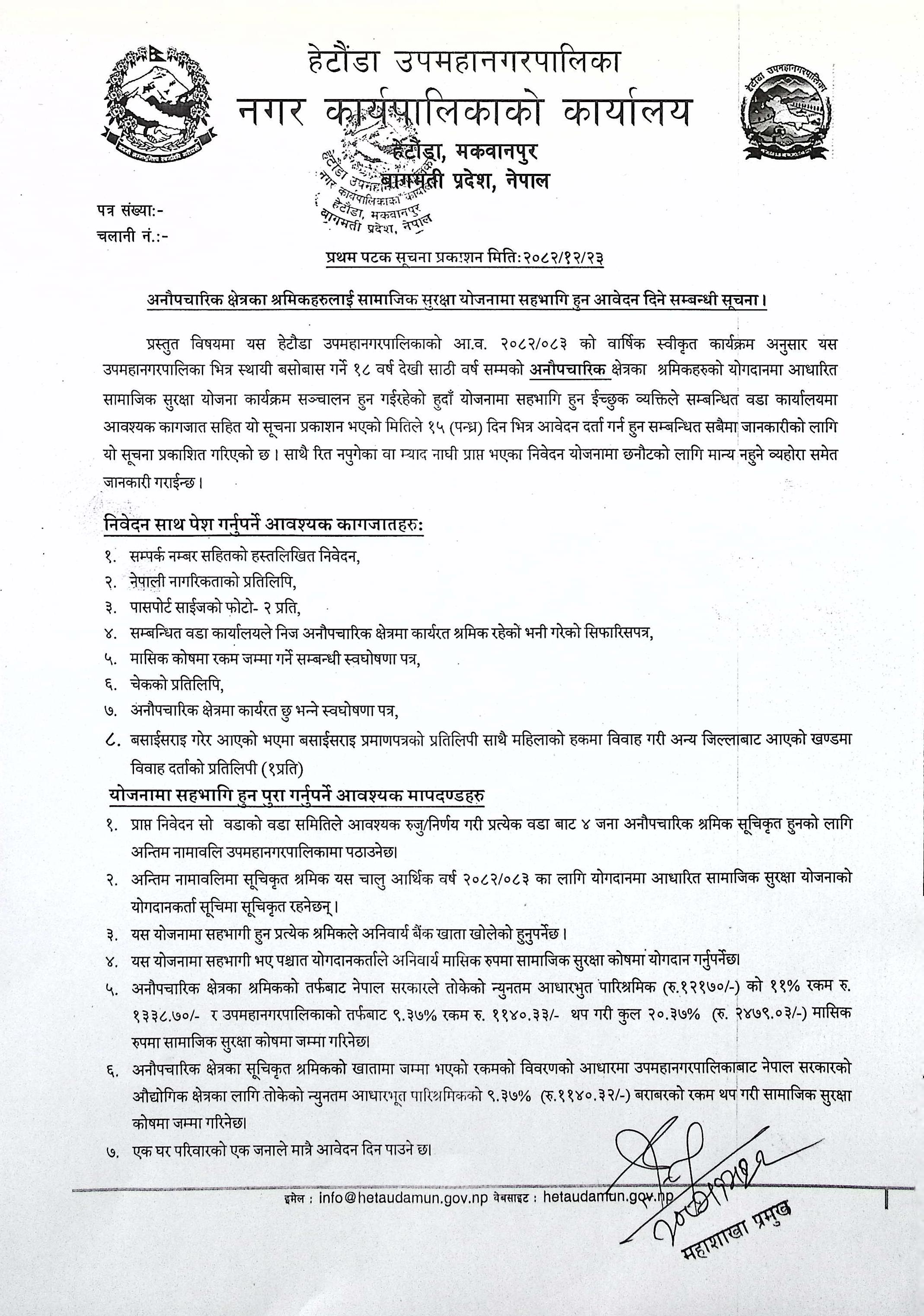 अनौपचारिक क्षेत्रका श्रमिकहरुलाई सामाजिक सुरक्षा योजनामा सहभागी हुन आवेदन दिने सम्बन्धी सूचना !!
