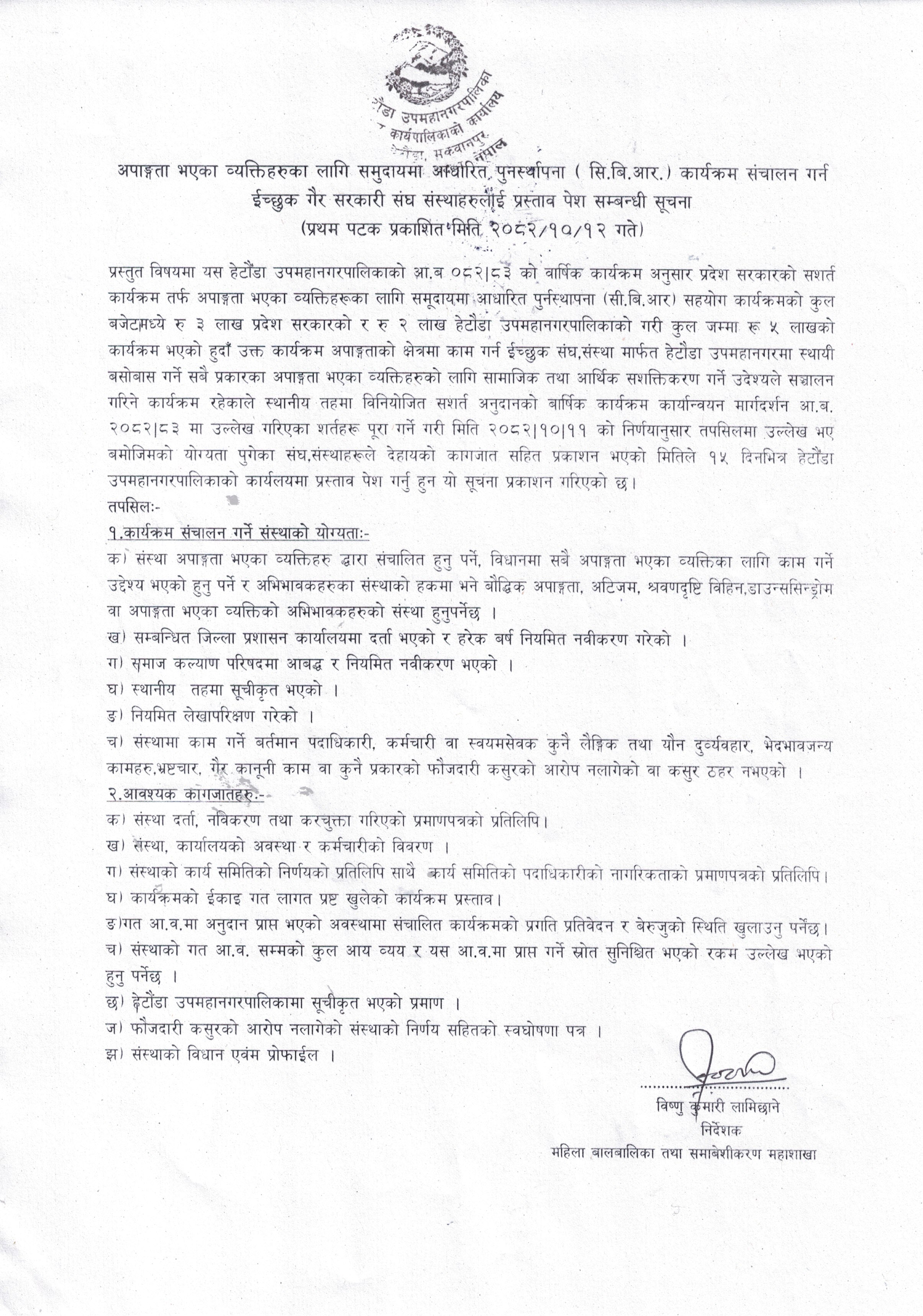 अपाङ्गता भएका व्यक्तिहरुका लागि समुदायमा आधारित पुनर्स्थापना (सि.बि.आर.) कार्यक्रम सञ्चालन गर्न ईच्छुक गैर सरकारी संघ संस्थाहरुलाई प्रस्ताव पेश सम्बन्धी सूचना !!